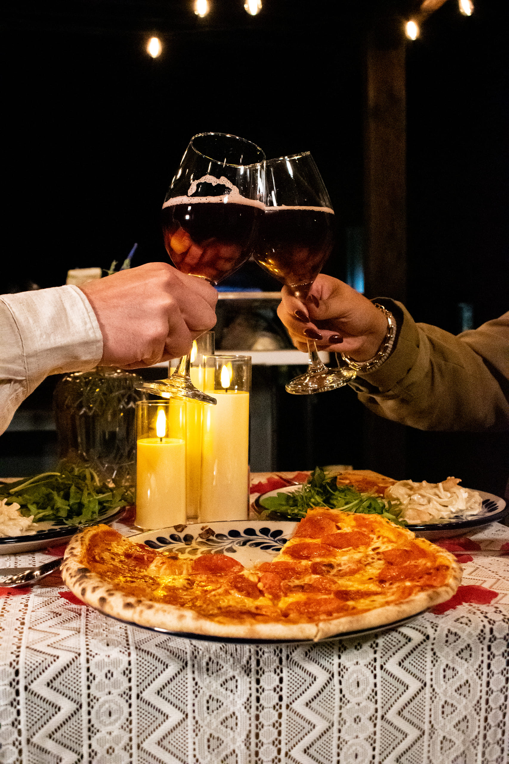 Una cena bajo las estrellas con decoración, pasta, pizza y clericot.