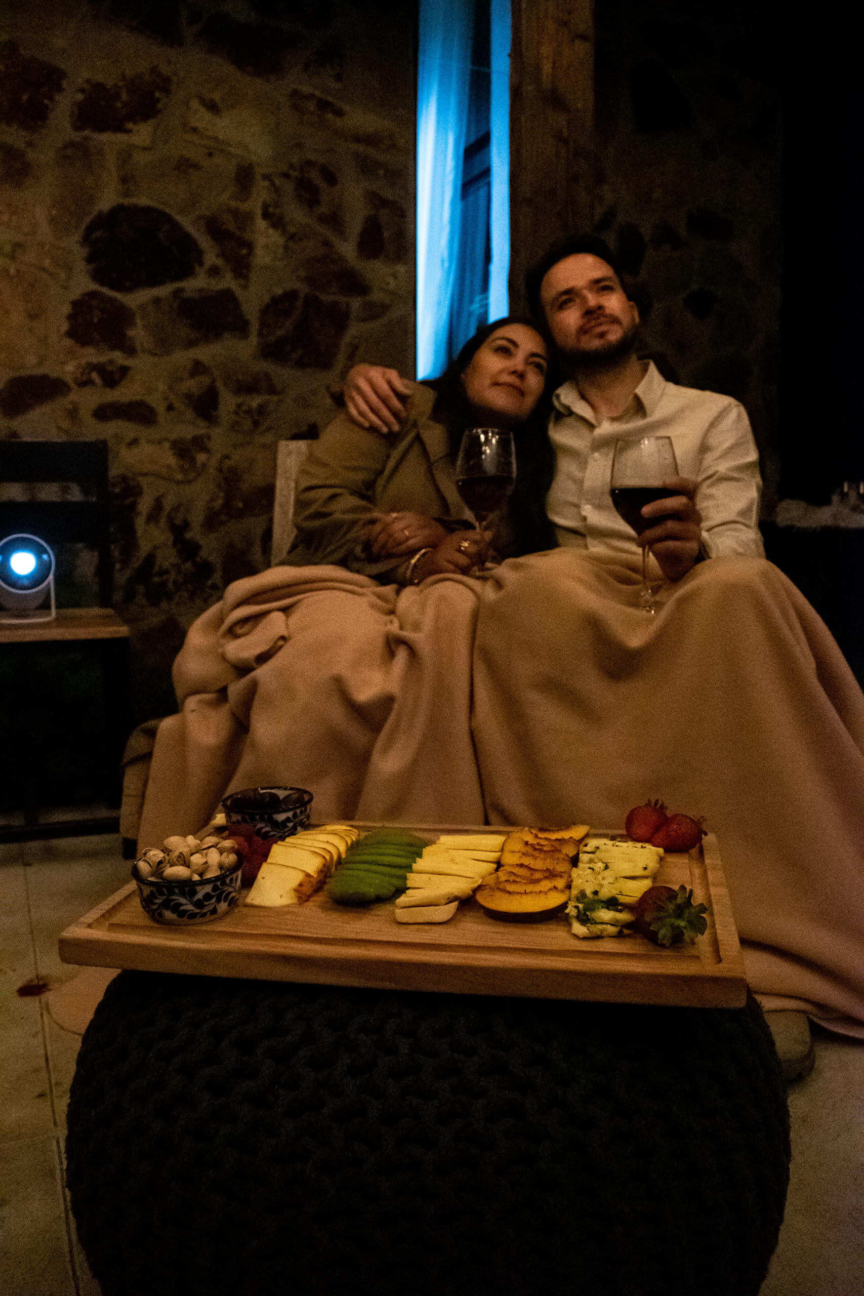 La magia del séptimo arte al aire libre con vino y una tabla de quesos.